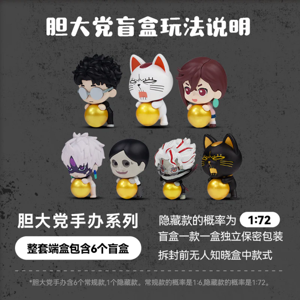 Probability: DAN DA DAN Pickabox series blind box figures include 6 regular versions and 1 hidden version. The probability of obtaining a regular version is 1 in 6, while the probability of getting the hidden version is 1 in 72. Please note: If you purchase a complete set of blind boxes that includes a hidden item, it will randomly replace one regular item.