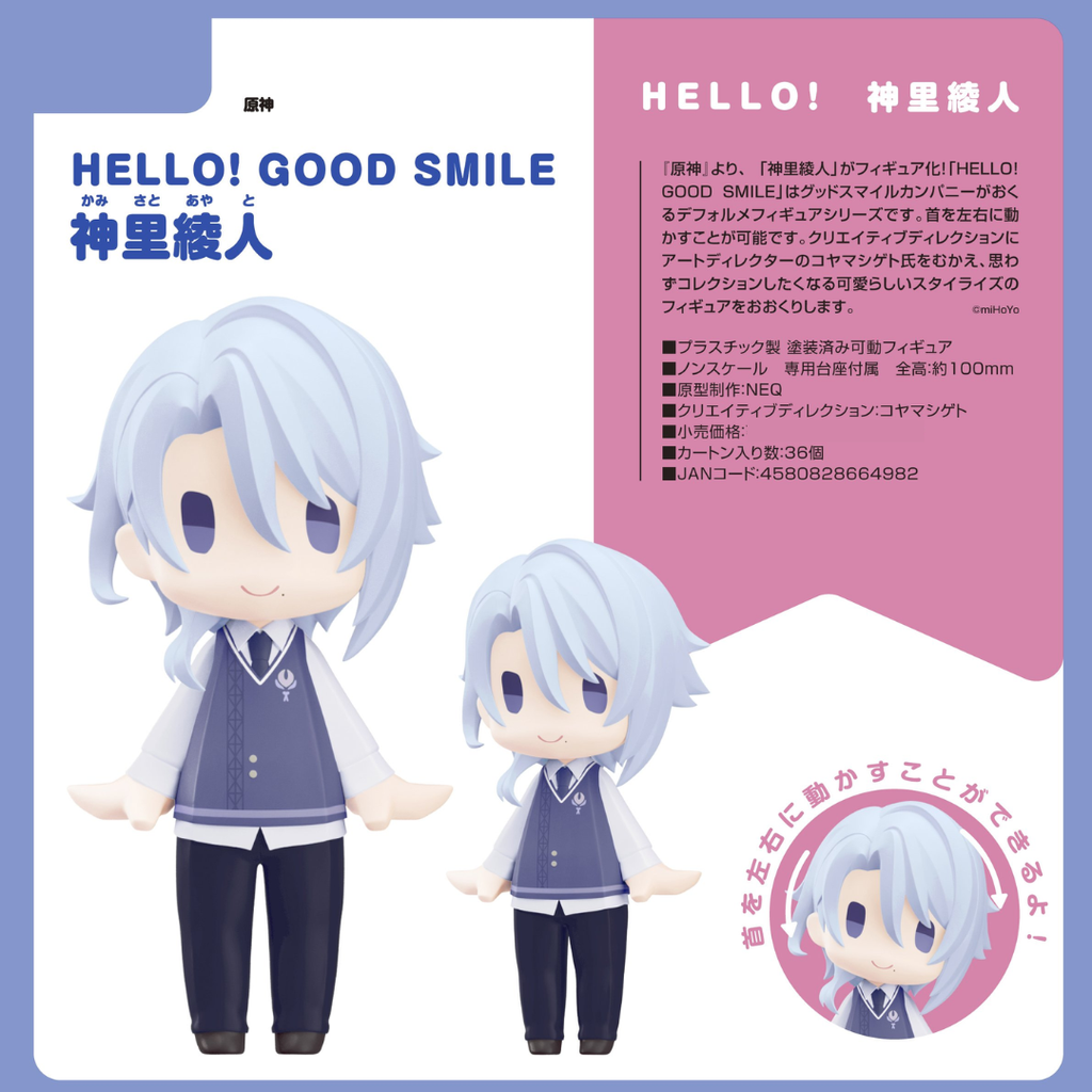 Presenting a new figure of Ayato Kamisato from "Genshin Impact"! HELLO! GOOD SMILE is a chibi figure series by Good Smile Company! The neck of each figure includes a simple joint that can be moved left and right. Made with the creative direction of art director Shigeto Koyama, HELLO! GOOD SMILE figures feature a cute chibi design that will leave you wanting more and more!